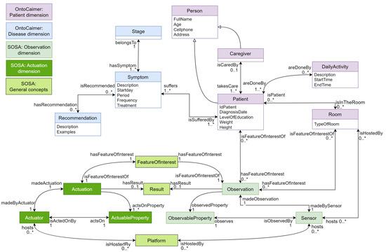 The main objective of OntoCaimer is to offer a platform that contains concepts related to the support and management of symptoms suffered by Alzheimer’s patients in each stage of the disease and which also covers knowledge about sensors and actuators. Having these two areas covered allows the systems that are proposed and developed to be used as a knowledge base or as a basis for creating artifacts that interact with the real world, giving the user design flexibility. The details of all the concepts covered by the ontology can be found later in the implementation stage in Section 4.3.