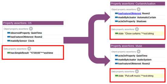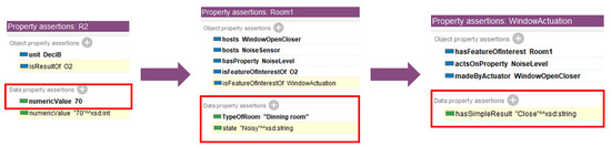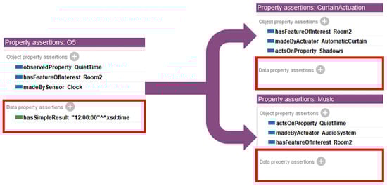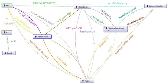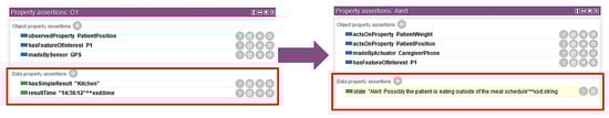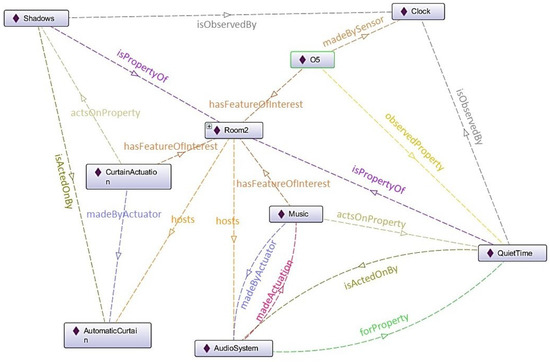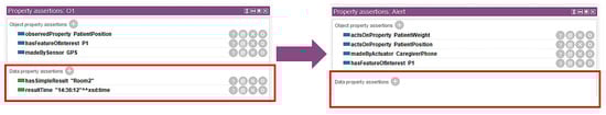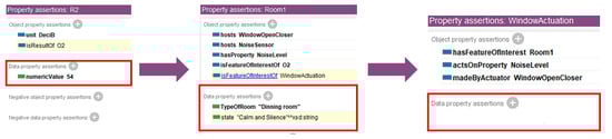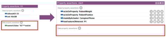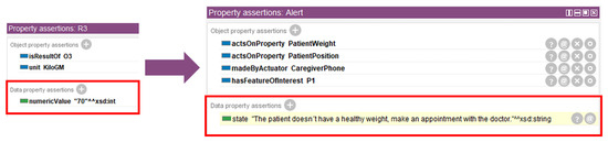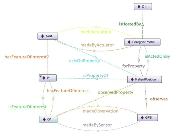 Based on the results obtained in the previous process, it was possible to obtain concepts and relationships that represent an overview of the symptoms suffered by a patient with Alzheimer’s, recommendations and preventive actions, and real-world (physical-world) concepts, namely sensors and actuators. After the creation of OntoCaimer, it was evaluated and improved. This process is explained in Section 5, related to the evaluation of the ontology.