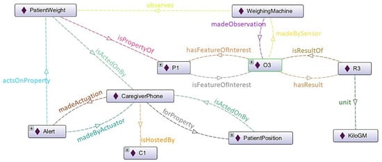 - As shown in Figure 1, the patient and disease dimensions are linked to the SOSA observation dimension through the relationships ‘hasFeatureOfInterest’, ‘isFeatureOfInterestOf’, ‘hosts’, and ‘isHostedBy’. This link originates from the concepts Patient and Room because the design proposed by the authors uses Room as the location for sensors and actuators and Patient as a feature of interest for the theoretically created automation system. This does not mean that only these two concepts can be used as shown in Figure 1 (it is a design proposed by the authors); the other concepts can be used as the OntoCaimer user wishes. For example, a symptom can be a feature of interest, or a caregiver can host the sensor. This all depends on the design of the solution.