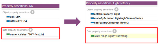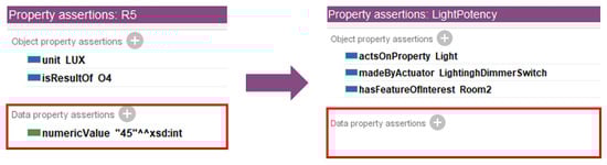 - OntoCaimer uses some concepts from the SOSA ontology. However, when instantiating the Actuation or Actuator concept, an error occurred in the inferences, as it inferred that both concepts were the same. This is because in the original design presented in [7], the ‘actsOnProperty’ relationship connects ActuableProperty with the two concepts mentioned, Actuation and Actuator, generating an erroneous inference. For this reason, ‘actsOn’ was created, a relationship that links Actuator with ActuableProperty, replacing ‘actsOnProperty’ between the three concepts and correcting the erroneous inference.