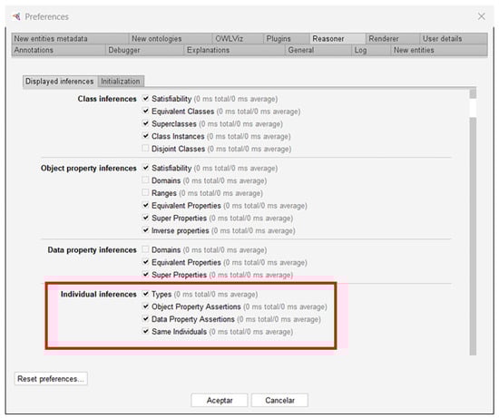 There are a variety of languages and formalisms for implementing an ontology, some of which are as follows: Ontolingua [39], OntoEdit [40], and Protégé [41]. This work was carried out with Protégé because its user interface is user-friendly and intuitive, and its features allow the creation, editing, and verification of ontologies and extraction of knowledge bases. In addition, this editor has strong support from the academic, governmental, and corporate communities. The version used for the implementation of Ontocaimer was Protégé version 5.5.0, which can be downloaded through the following link created on GitHub, thus facilitating its replicability and extension for the community and interested researchers accessed on 1 September 2025: https://github.com/ldlasso2/OntoCaimer/blob/master/Protege-5.5.0-win.zip. In addition, Web Ontology Language (OWL) was used, mainly because Protégé allows the creation and implementation of OWL ontologies and because, according to the World Wide Web Consortium (W3C), Web Ontology Language (OWL) is a language that facilitates the automatic interpretation of content and provides additional information and vocabulary along with formal semantics, making it a more favorable choice than other languages such as Extensible Markup Language (XML), Resource Description Framework (RDF), and RDF Schema (RDF-S). As a result, each Ontocaimer concept became a class, each attribute became a data property across domains, and each relationship became an object property.