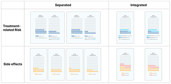We conducted a 2 × 2 within-subjects factorial experiment to investigate how visual presentation formats of icon arrays affect users’ comprehension of treatment-related risk information. Two layout factors were manipulated: (1) treatment-related risk presentation (separated vs. integrated), and (2) side effect risk presentation (separated vs. integrated).