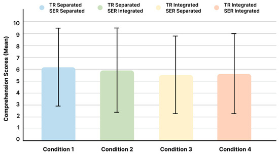 Estimated marginal means (EMMs) showed that comprehension was highest when both treatment-related risk and side effect risk were presented in a separated format (Condition 1: EMM = 6.165), followed by Condition 2 (EMM = 5.893), Condition 4 (EMM = 5.587), and Condition 3 (EMM = 5.504). Pairwise comparisons using Bonferroni adjustment revealed that Condition 1 significantly outperformed both Condition 3 (p = 0.005) and Condition 4 (p = 0.009). Other comparisons were not statistically significant. Table 6 and Table 7 report these results, while Figure 4 presents the adjusted estimated marginal means of comprehension scores across layout conditions.
