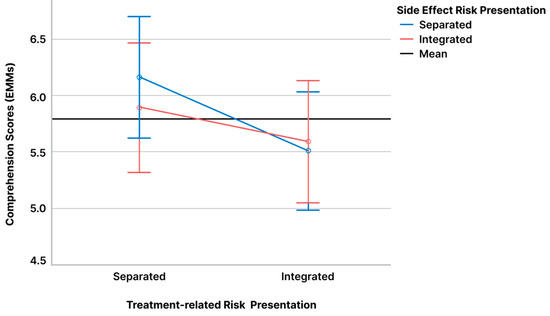 The analysis revealed a significant main effect of treatment-related risk presentation. Comprehension scores were higher for separated presentations (M = 6.03, SD = 3.23) than for integrated presentations (M = 5.55, SD = 3.15), F(1, 120) = 12.46, p < 0.001, partial η2 = 0.094 (Figure 2, Table 2). In contrast, the main effect of side effect risk presentation was not significant, F(1, 120) = 0.54, p = 0.47, partial η2 = 0.004. Comprehension scores were comparable between the separated (M = 5.83, SD = 3.09) and integrated (M = 5.74, SD = 3.28) side effect formats. The interaction between treatment-related risk and side effect risk presentation was also not significant, F(1, 120) = 1.72, p = 0.193, partial η2 = 0.014 (Table 3).