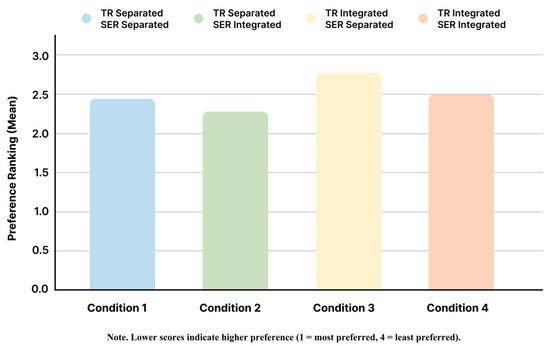 Descriptive statistics revealed that the layout combining Treatment Separated + Side Effect Integrated was most preferred (Mean Rank = 2.28), followed by Treatment Separated + Side Effect Separated (2.45), Treatment Integrated + Side Effect Integrated (2.50), and Treatment Integrated + Side Effect Separated (2.77), which received the lowest preference ranking. Figure 5 depicts the mean preference rankings for each layout condition.