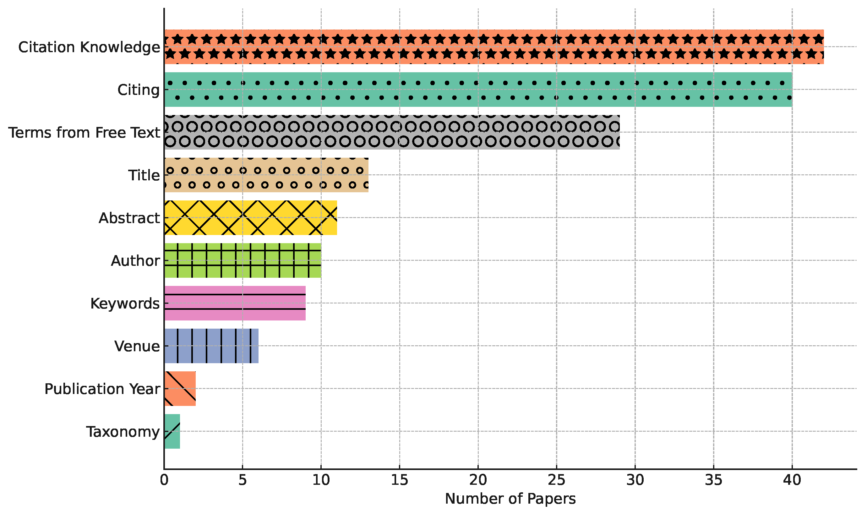 | Citation Section | Refers to the section of a paper where the citation appears (e.g., the introduction or related work) [139,168]. Different sections imply different relevance. Ref. [168] explored this notion in combination with citation graphs, finding improved performance, especially for citations in the introduction, background, and method sections. |