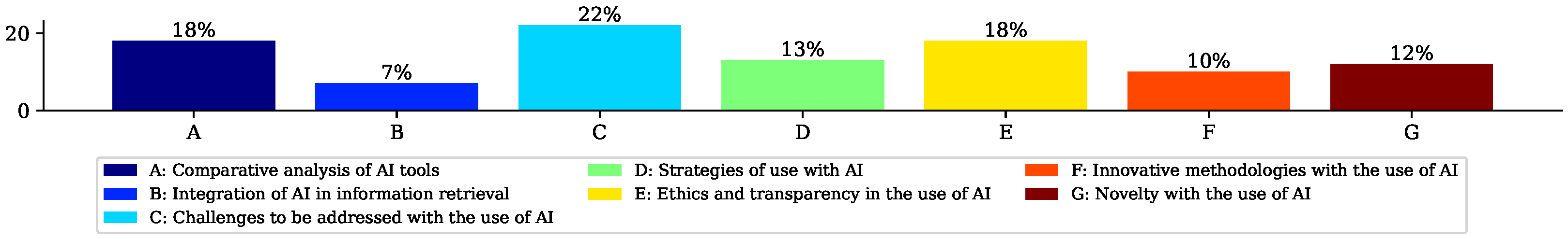 AI in academic and research production | Applications in research processes. | [7,9,21,24,25,29,30,34,40,42,49,50,52,53,58] | 25.0% |