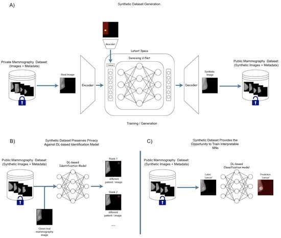 One of the main challenges in the development and training of neural networks for medical image analysis is access to sufficient volumes of data [12]. Sharing medical data is a complex issue due to stringent privacy and data protection requirements. A large portion of medical data remains isolated and stored locally in medical institutions and laboratories due to concerns related to patient data privacy [13,14]. As a result, access to medical data for research purposes and the training of neural networks can be significantly restricted. A practical way around data-sharing limits is to create synthetic patient data that keeps the original dataset’s statistics without exposing personal information. For instance, ref. [15] presents two differentially private methods for image obfuscation: pixelization with perturbation to the pixelized image and the application of Laplace perturbation to each pixel with Gaussian blur afterward. Ref. [16] presents a privacy-preserving automated method for breast density classification using craniocaudal (CC) view mammograms from the VinDr-Mammo dataset. Although synthetic data can be generated for all types of data modalities, this work focuses on mammogram images.