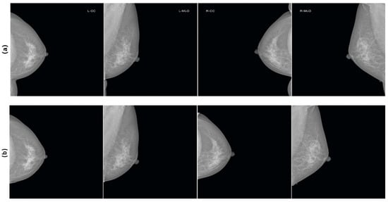 The VinDr-Mammo dataset [43], which was released recently, contains 5000 mammographic studies (four images per patient, totaling 20,000 digital mammograms). The annotated examinations are split into a training set of 4000 studies and a test set of 1000 studies. The dataset uses the BI-RADS classification system. Images are classified according to the solution proposed in [44], specifically: categories 1 and 2 as “normal”, categories 4 and 5 as “cancer”, with category 3 excluded. Therefore, the images have two labels: {cancer, normal}.