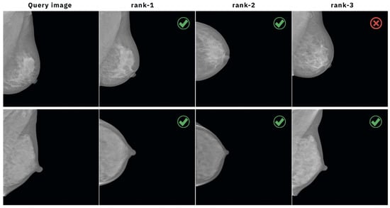 We conducted an experiment to evaluate the model’s ability to identify a patient. A patient is considered identified if their mammogram image is among the top 3 results returned by the model (top@3). It is important to note that during the dataset split into training and validation sets, if one image of a patient is included in the training set, all other images of that patient will also be in the training set. Thus, there is no overlap of patients between the sets.