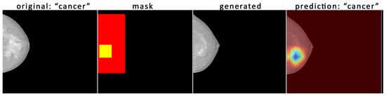 Example of the image generation. From left to right: (1) real mammogram labeled as cancer; (2) corresponding mask where red denotes the breast region and yellow indicates the lesion location; (3) image generated conditionally on the mask; (4) Grad-CAM visualization of a pretrained classifier showing attention focused on the lesion area and predicting cancer.