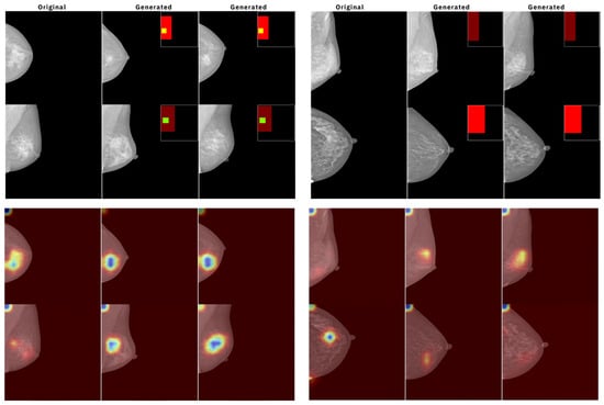 Visual comparison of real and conditionally generated mammograms. The top rows show the original images alongside the corresponding generated samples conditioned on the lesion masks, where the red area on the mask denotes the breast region and the yellow area indicates the lesion location. The bottom rows present Grad-CAM visualizations for both the original and generated images, highlighting the classifier’s attention regions.