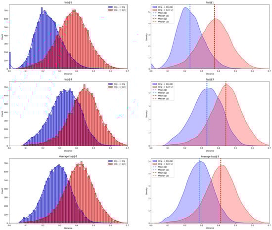 Comparison of distances in the Test set. Distances between images from the original and original dataset (blue) and from the original and generated dataset (red).