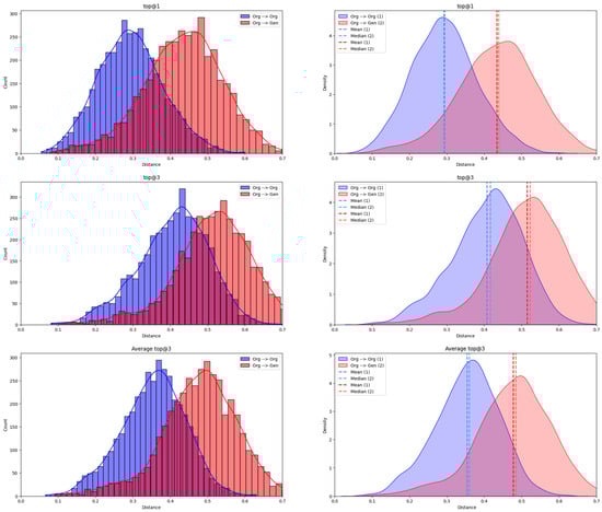 Comparison of distances in the Train set. Distances between images from the original and original dataset (blue), and from the original and generated dataset (red).