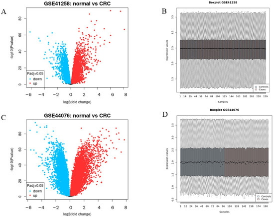 Bioinformatics analysis of colon cancer patients from GSE41258 and GSE44076. (A,C) Differentially Expressed Genes (DEGs) were clustered between colorectal cancer and normal tissue from colorectal patients as shown in the volcano plot. The blue and red dots represent down- and up-regulated genes, respectively. (B,D) A normalization of data pairs of healthy normal subjects and patients with colorectal cancer.