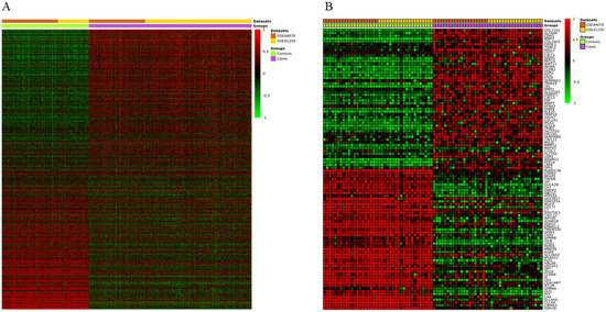 Hierarchical clustering heatmap of the overall (A) and top one hundred (B) DEGs between colorectal cancer and normal samples in GSE41258 and GSE44076. Each row represents a DEG and each column represents a different sample.