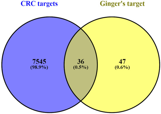 The analysis of the GEO database, composed of the GSE41258 and GSE44076 datasets, identified 7587 DEGs based on the cutoff criteria. A volcano map and distribution clustering heatmap of the identified DEGs are shown in Figure 1. The overall top 100 clustering heatmap of significant DEGs is shown in Figure 2. In addition, a total of 36 intersection DEGs among colorectal cancer and ginger target genes were retrieved for further mechanistic investigations of ginger in the treatment of colorectal cancer (Figure 3).