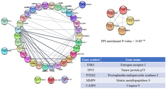 Protein–protein interaction (PPI) network and hub-gene selection. Five hub genes were selected, including ESR1, TP53, PTGS2, MMP9, and CASP9; the p-value of the protein network is less than 1.0 × 10−16. Full names of the five selected hub genes.