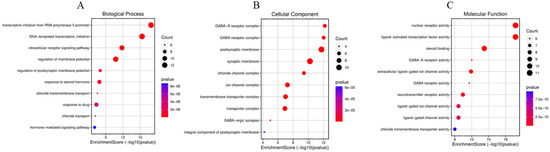 The dot plot shows the results of gene ontology analysis of ginger’s target genes related to colorectal cancer composed of (A) biological process (BP), (B) cellular component (CC) and (C) molecular function (MF). The size and color are determined by the number of associated genes and their p-values, respectively.