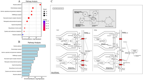 KEGG pathway enrichment analysis. (A) A dot plot of enriched pathways, the size and color revealed the number of associated genes and their p-values, respectively. (B) A bar chart of pathway enrichment. (C) The most significant enriched pathway from the KEGG analysis was nicotine addiction (GABAergic signaling).