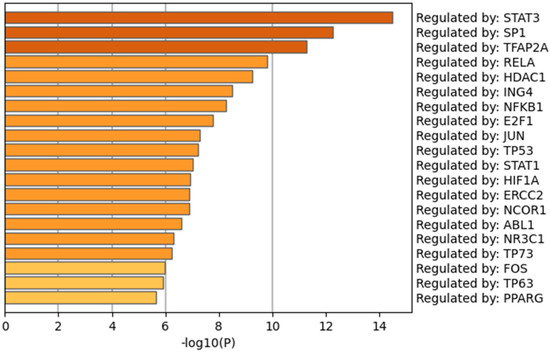 A bar chart showing the results of Transcription factor (TF) enrichment analysis. The length and color of each bar represent the −log10 of the p-value and the degree of enrichment, respectively.