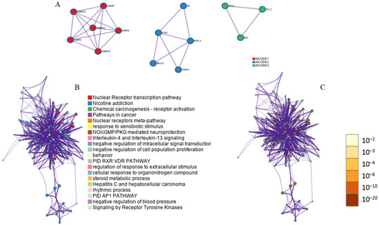 MCODE (Molecular Complex Detection) enrichment analysis by Metascape. (A) PPI network MCODE component. (B,C) GO enrichment analysis was implied to each MCODE network to assign “meanings” to the network component. The shedding of orange color represents the significant p-value.