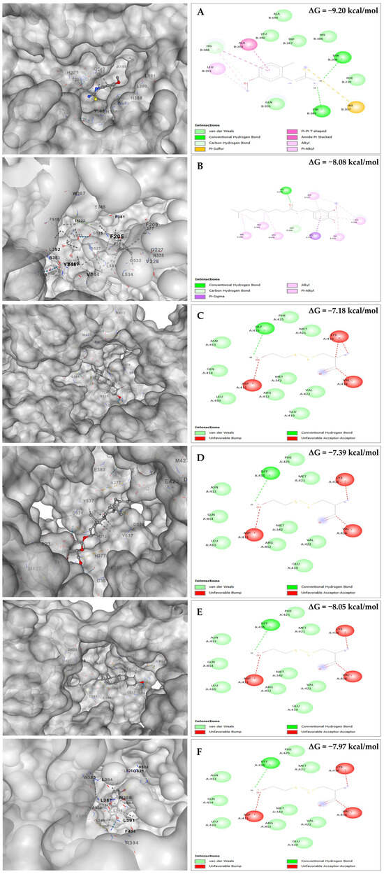 Molecular docking of PTGS2(COX2) and ESR1 with selected ginger component compounds and their binding affinities (ΔG). (A) High-resolution of COX2 and Methyl diacetoxy-6-gingerdiol with key residues: Leu391 (π-bond), His388 (π-bond and H-bond), Ala202 (π-bond), Thr206 (H-bond), His207 (π-sulfide bond) and Tyr385 (H-bond) in the active site. (B) High-resolution of COX2 and Dihydrocapsaicin with key residues: Phe209 (π-bond), Phe381 (π-bond), Leu534 (π-bond), Leu352 (π-bond), Val523 (π-bond), Val349 (π-bond), Ala527 (π-bond) and Leu531 (H-bond) in the active site. (C) High-resolution of ESR1 and β-sitosterol with key residues: Asp411 (H-bond), Val418 (H-bond), Lys416 (H-bond) and Gly415 (H-bond) in the active site. (D) High-resolution of ESR1 and stigmasterol with key residues: Asp411 (H-bond), Val418 (H-bond), Lys416 (H-bond) and Gly415 (H-bond) in the active site. (E) High-resolution of ESR1 and poriferast-5-en-3beta-yl beta-D glucopyranoside with key residues: Asp411 (H-bond), Val418 (H-bond), Lys416 (H-bond) and Gly415 (H-bond) in the active site. (F) High-resolution of ESR1 and Euxanthone with key residues: Asp411 (H-bond), Val418 (H-bond), Lys416 (H-bond) and Gly415 (H-bond) in the active site.