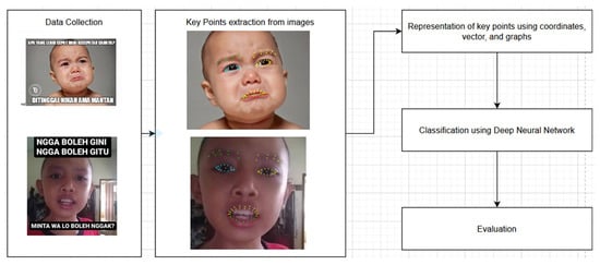 Various techniques have been used to recognize features of objects within images, including the utilization of key points. Arwoko et al. [26] used key points to recognize finger movements representing the numbers 1 through 5, in which the proposed Deep Neural Network (DNN) model achieved an accuracy of 99%. Hangaragi et al. [27] used facial points (key points) to recognize eyes, nose, mouth, and outer facial lines which are then further used to detect human faces. The goal of the study was to create a facial recognition system based on a DNN model, which achieved an accuracy of 94.23%. The use of key points for feature extraction and the use of DNN models for classification in research [21,22] was proven to produce a high level of accuracy. Therefore, in this research, key points are used for feature extraction in meme images, while a DNN is used for one of the classification models. By using key points, facial features that are needed for image sentiment classification can be extracted. This is different from the research by Aggarwal et al. [19] and Rosid et al. [22], in which sentiment classification was conducted with the use of all the features within the image.