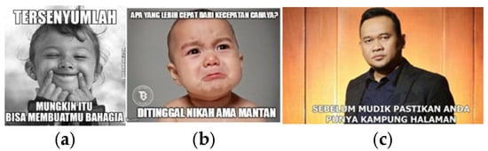 Despite extensive research on sentiment analysis, the number of studies that focus on memes is still limited [18]. Sentiment analysis has been frequently used to classify public comments/reviews regarding products, services, policies, and other subjects. Previous studies that have carried out sentiment analysis of memes using meme datasets include hateful meme classification [19,20], sentiment analysis-based emotion detection [21], sarcasm detection [18,22], and identification of offensive content within memes [23]. All these studies focus on meme datasets that contain non-Indonesian text, indicating the scarcity of research on sentiment analysis using meme datasets that contain Indonesian text.