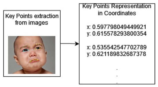 Facial key points are the vital areas on a face, from which the facial expression and emotion of a person can be evaluated. Hangaragi et al. [27] developed a face detection and recognition model using key points. These key points represent the eyes, mouth and outermost facial lines. Facial expressions that reflect emotions can be characterized from various parts of the face, including the eyes, eyebrows, and mouth [41]. In this study, key points representing eyebrows, eyes, and lip lines are the analyzed facial features. Key points are outlined using Python and the media-pipe library. By using the media-pipe library, a face is represented by 468 points. There are 18 key points for the eyebrow line, 32 key points for the eyes, and 47 key points for the lips. It should be acknowledged that each image is analyzed using 97 key points.