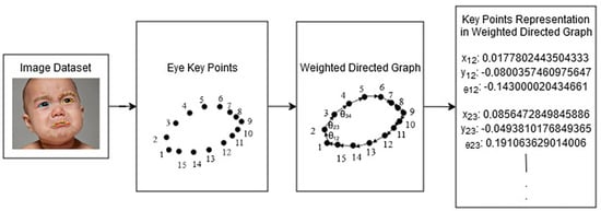 The normalized vector is then modeled and classified using a machine learning model. Figure 4 shows the classification process using key points in the form of vectors. For example, if there are n key points of an eye feature and one of the key points (key point 1) is used as a reference point, then (n − 1) vectors are obtained. For the vectors are calculated as follows: