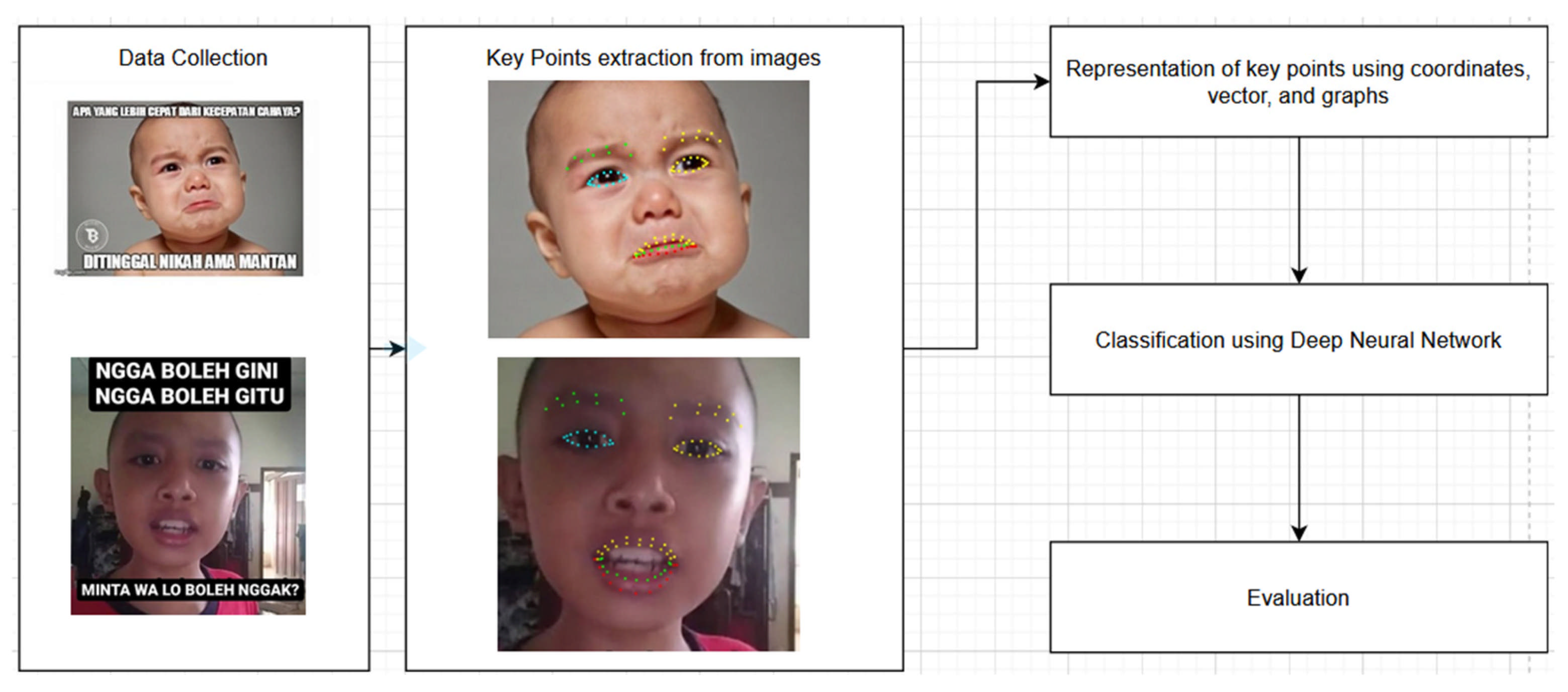 21] using machine learning methods is still around 75.4%, further innovation is needed. By using key points, image detection can be carried out in the required areas (corners, edges, unique patterns) so that the model does not process the entire image. This can speed up the process, reduce computing load, and save memory. Therefore, the contributions of this study are as follows (1) Developing a human facial sentiment detection model using key points, (2) Representing key points as various graphs, (3) Constructing a meme dataset with Indonesian text.