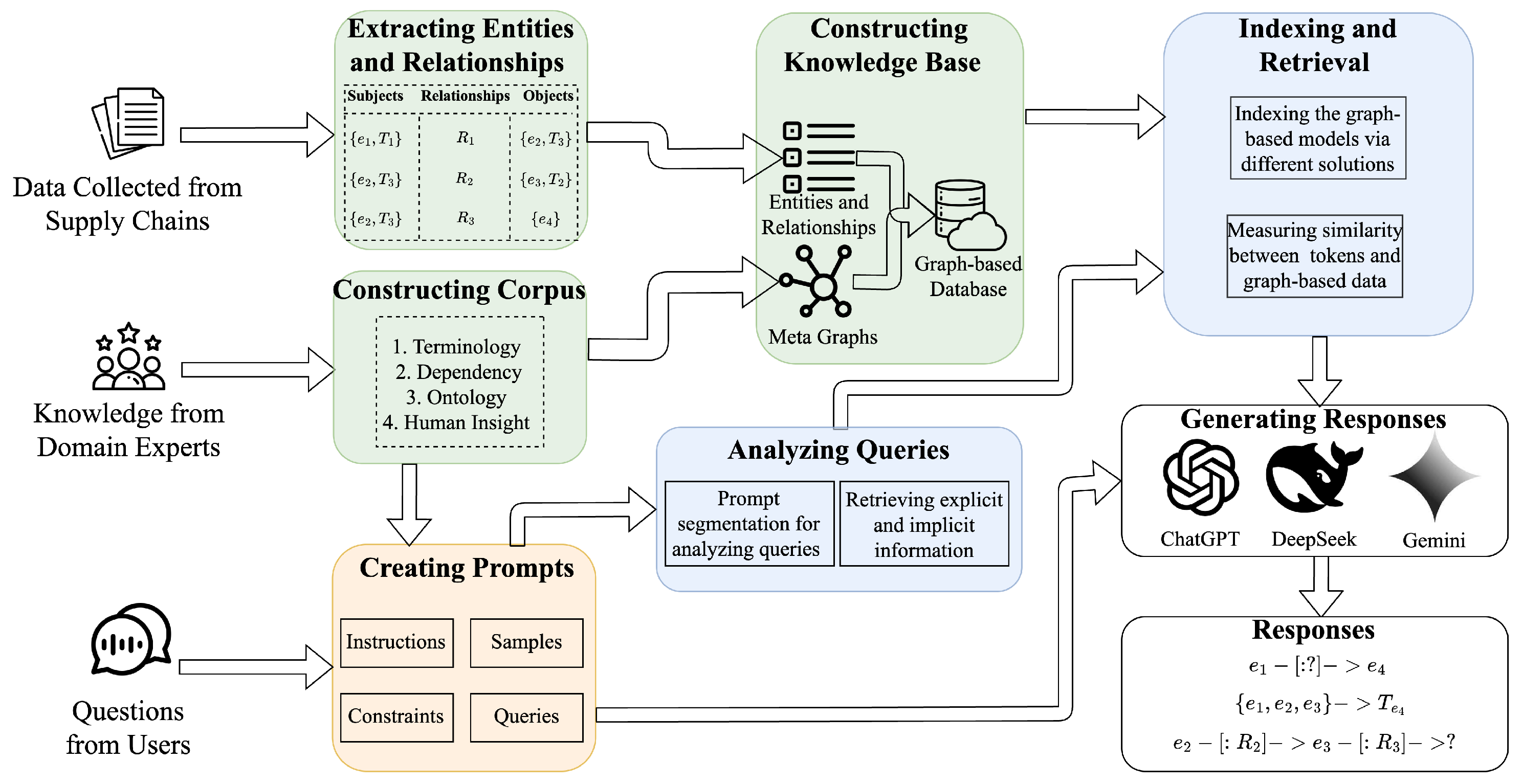 - Proposing a framework that integrates the knowledge base and LLM to support the analysis and reasoning across the graph-based data in the context of supply chain management;