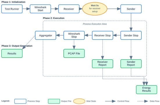 Testbench diagram showing test execution workflow with three phases: initialization (Wireshark start, receiver setup), execution (sender operation with concurrent monitoring), and aggregation (log processing and report generation).