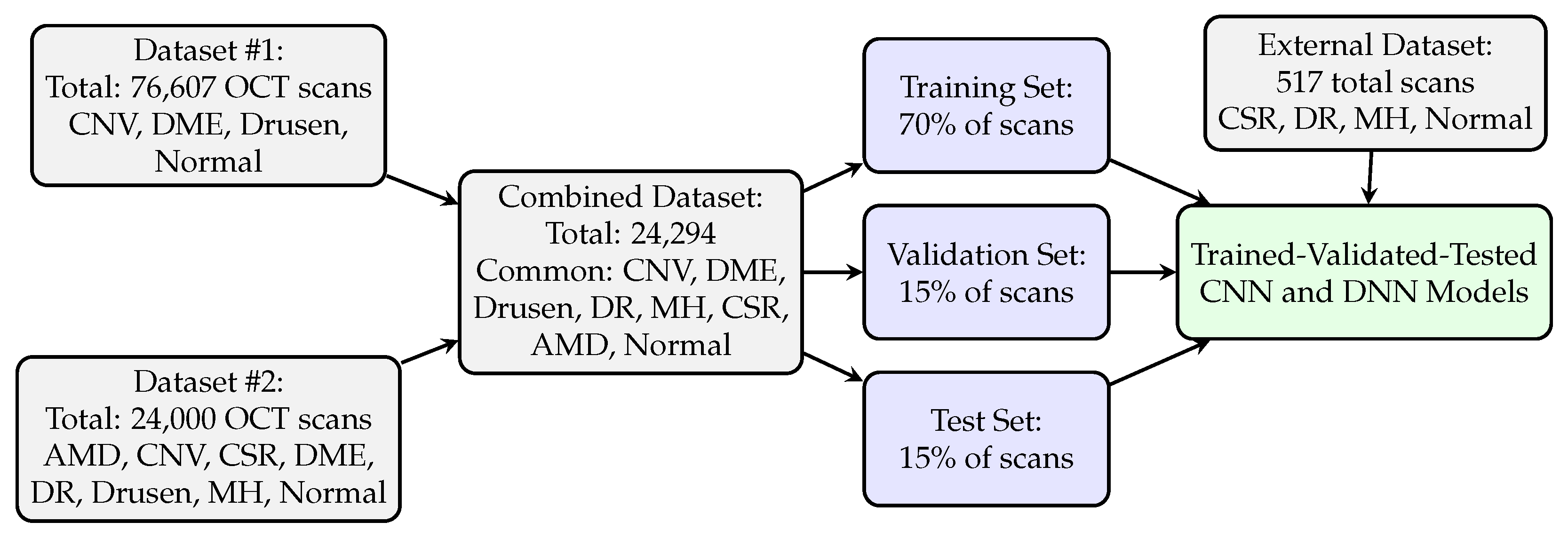 The DNN’s external validation accuracy of 76%, while representing a decline from internal performance metrics, warrants careful interpretation within the broader context of clinical ML development. First, the presence of external validation itself distinguishes this work from the majority of published OCT classification studies, which typically report only internal test set performance without independent dataset assessment. Second, the monotonic performance decrease from training (82%) through validation (81.5%), test (81%), to external validation (76%) represents a fundamental indicator of model reliability and methodological integrity. This gradual, consistent decline demonstrates that the model has learned generalizable patterns rather than memorizing dataset-specific artifacts. In contrast, models exhibiting inflated internal accuracies (approaching 95–100%) without external validation evidence, or those showing non-monotonic performance patterns, may achieve superficially impressive metrics while masking serious generalization failures that would only become apparent upon clinical deployment. The 76% external accuracy, though modest, provides an honest, conservative estimate of real-world performance expectations. Such transparency is essential for responsible clinical translation, as overestimating model capabilities based on inflated internal metrics poses direct risks to patient safety. This work prioritizes methodological rigor and honest performance reporting over the pursuit of artificially elevated accuracy figures. The established baseline of 76% external accuracy, achieved through demonstrably healthy training dynamics and rigorous multi-tier validation, provides a reliable foundation for future model refinements. Incremental improvements built upon this methodologically sound framework will yield clinically trustworthy systems, whereas models reporting higher accuracies without equivalent validation rigor cannot be safely translated to patient care regardless of their numerical performance claims.