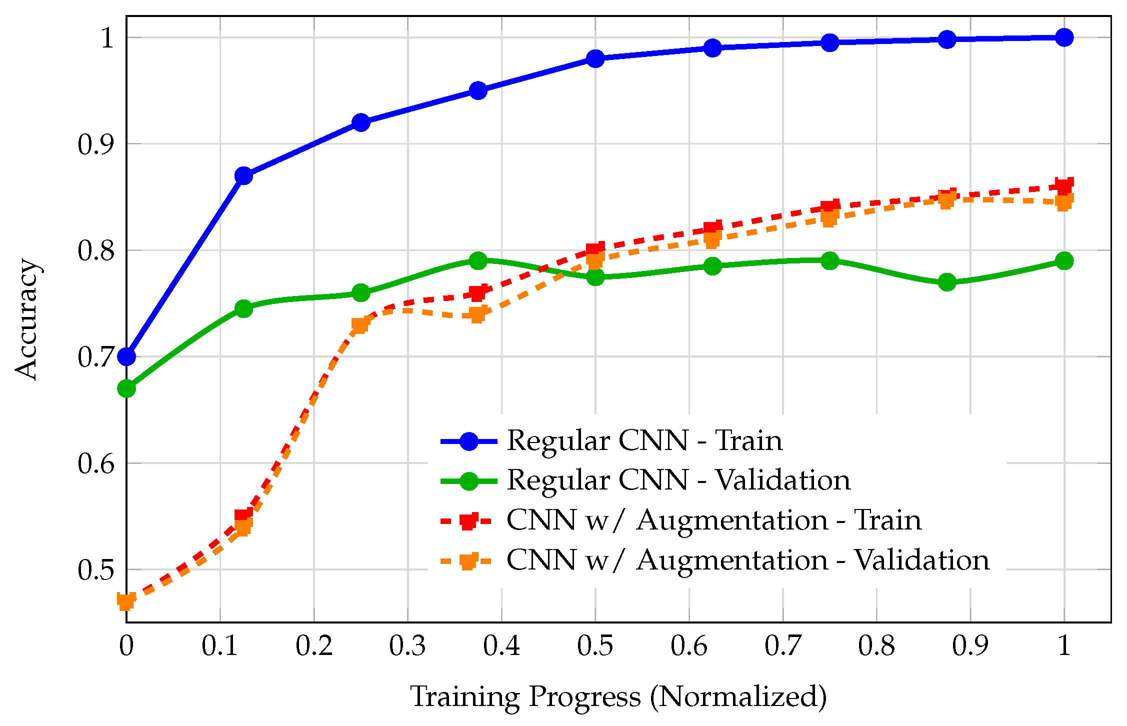 In contrast, the augmented CNN demonstrated healthier learning dynamics. Both training and validation accuracies started at realistic baselines (47%) and converged smoothly, with the validation curve closely tracking the training curve and ending at 84.5% (validation) versus 86% (training). This small, expected gap, where training accuracy remains slightly higher than validation accuracy, reflects robust generalization and effective regularization. Overall, the augmented CNN’s learning curves were markedly better than both LightGBM and the regular CNN. The DNN’s learning curves (