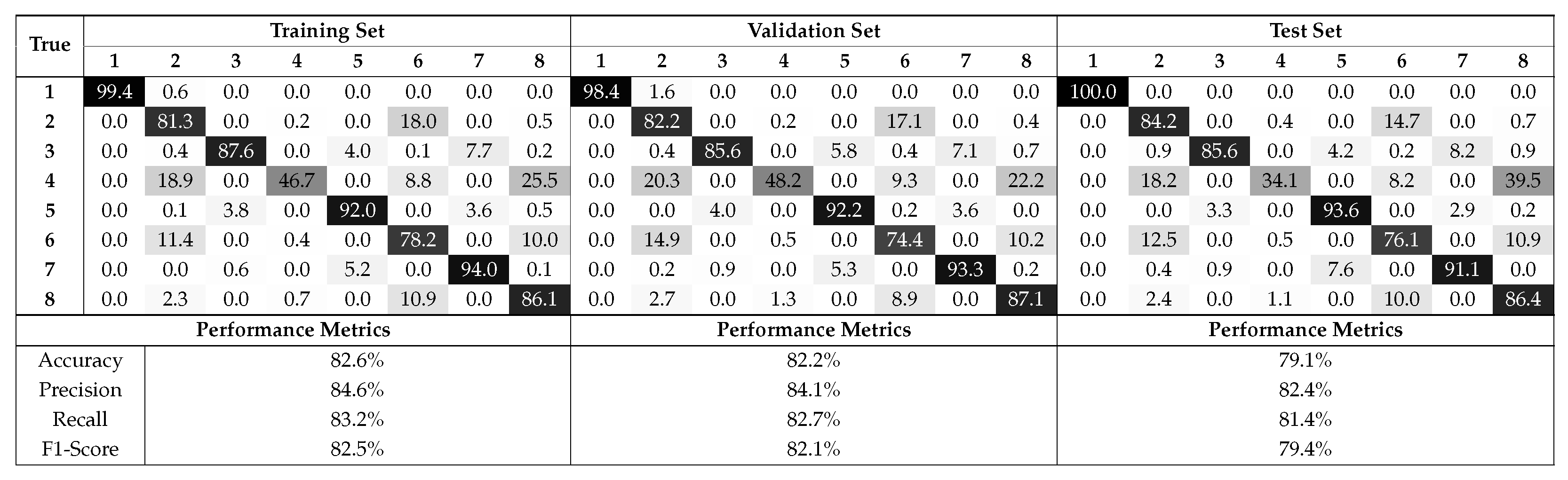 Figure 6) revealed that most errors were concentrated among classes 2, 4, and 6, with notable off-diagonal confusion, especially for class 4, which had substantial misclassification into classes 2, 6, and 8. This pattern may reflect clinical or feature overlap among these categories.
