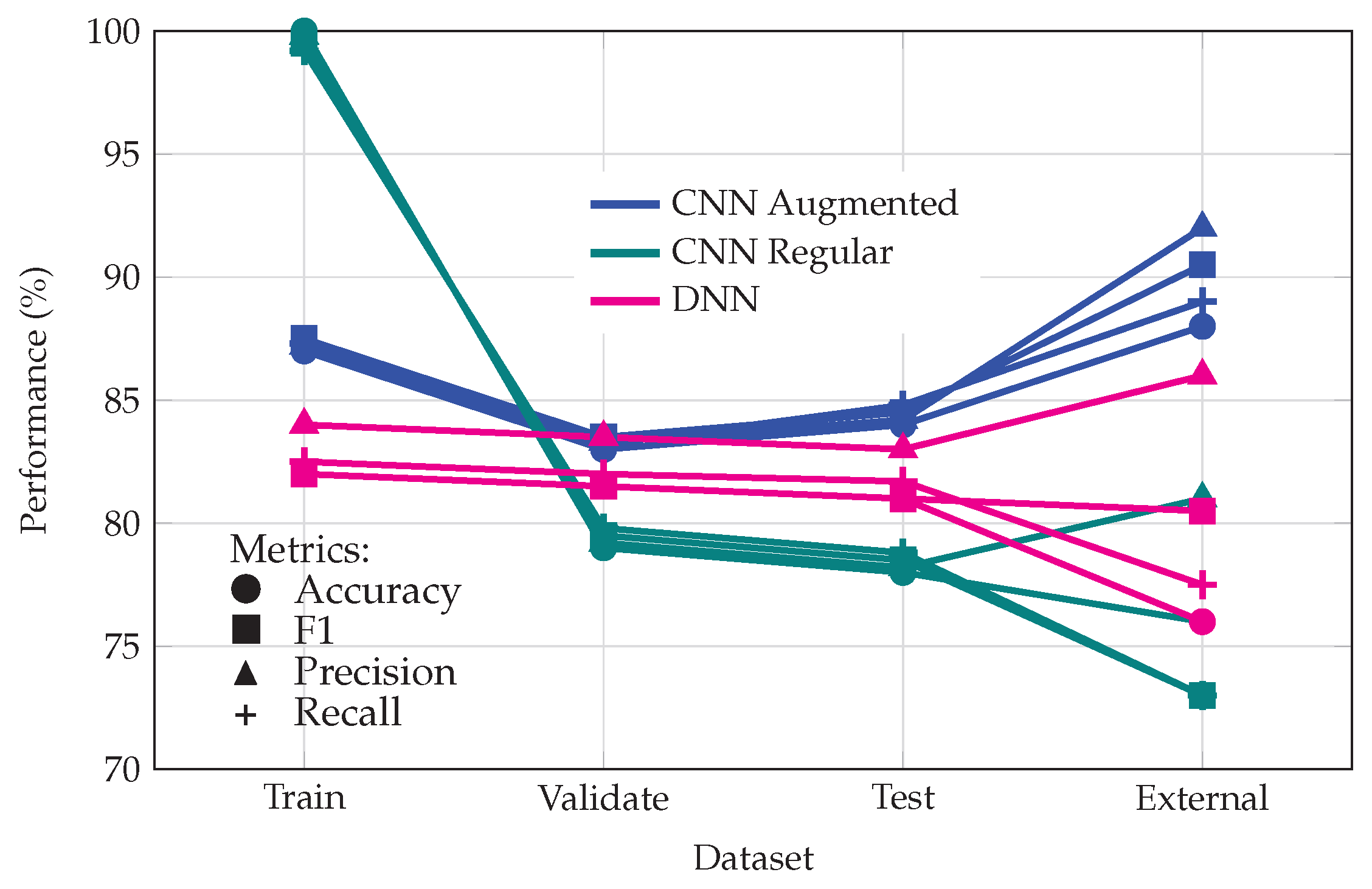 Figure 7), the DNN was the only model to exhibit the expected monotonic decrease in most performance metrics from training to validation to test to external. The only exception was precision, which increased on the external set; likely reflecting a more conservative prediction strategy in response to distributional shift, where the model made fewer positive predictions but with higher accuracy. In contrast, the augmented CNN showed non-monotonic improvement, with external set metrics (e.g., accuracy up to 90.5%, precision up to 92%) exceeding those on the test and even training sets. This is highly unusual and suggests either a mismatch in data splits, potential leakage, or that the external set was inadvertently easier for the model.