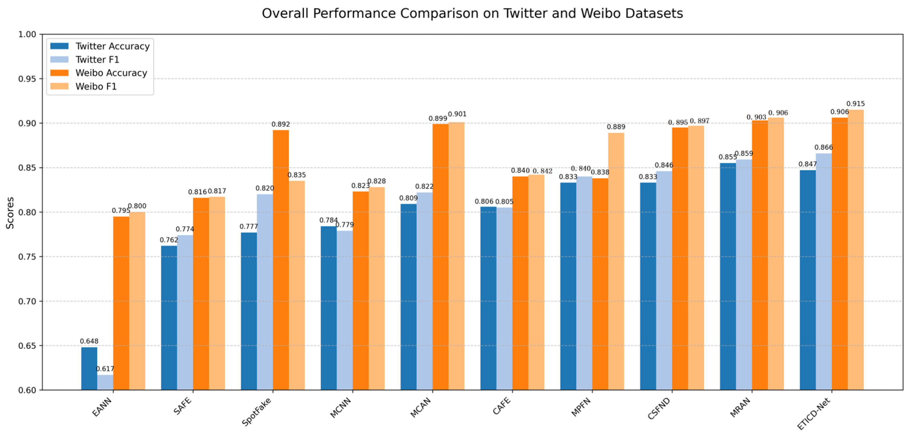 - In the state-of-the-art models, ETICD-Net achieves a significantly higher F1 score (0.866) on the Twitter dataset compared to MCAN (0.822), CAFE (0.805), and MPFN (0.840). Simultaneously, it attains the best accuracy (0.906) and F1 score (0.915) on the Weibo dataset. Regarding comparisons with MRAN, we conducted a multi-faceted analysis: on the Twitter dataset, our accuracy (0.847) was slightly lower than MRAN’s (0.855), but our F1 score (0.866) was higher with a clear advantage; On the Weibo dataset, our model outperformed MRAN in both accuracy (0.906 vs. 0.903) and F1 score (0.915 vs. 0.906). This discrepancy reflects differing design priorities: MRAN excels at handling specific sample types, while ETICD-Net achieves more balanced and robust overall performance through high-level semantic guidance.