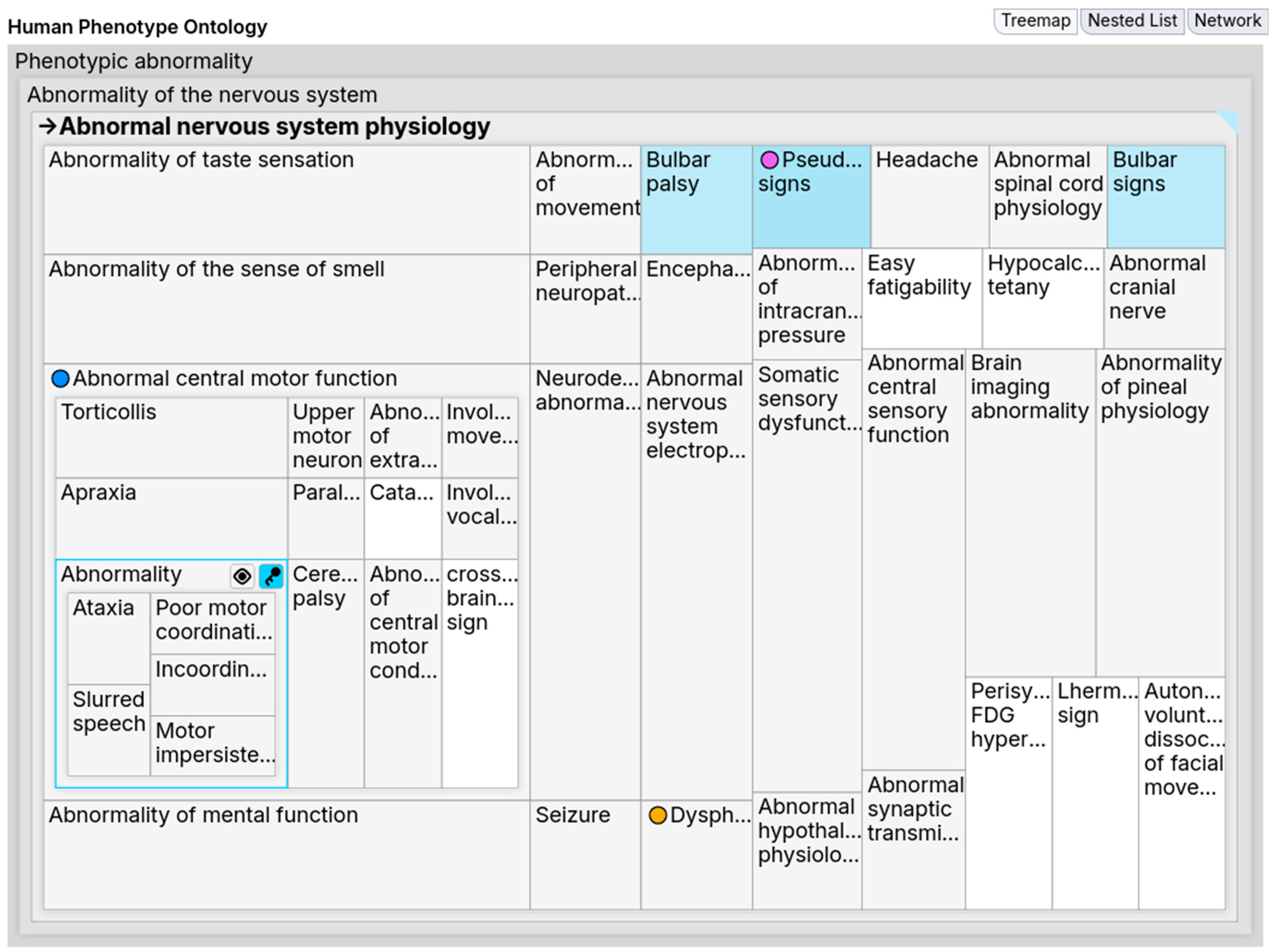 After FuzzyVis loads HPO, its front-end—displaying a nested-treemap as the primary visualization—presents the ontology to the user. The user starts their exploration by adjusting the settings in the visualization control panel. First, the user sets cell scaling to be equal, as the relative size of concepts is irrelevant to their goals. Second, the user sets the tiling so that labels are clearly visible. Lastly, they set visible depth to a low value—HPO has many terms, and seeing too many layers is overwhelming. Afterwards, the user creates highlight rules to stain concepts containing voice, speech, or swallowing for quick identification. With the user’s initial setup complete, they can now quickly identify concepts of interest. Users of FuzzyVis can, with little effort, set up the primary visualization in ways that streamline their future searches.