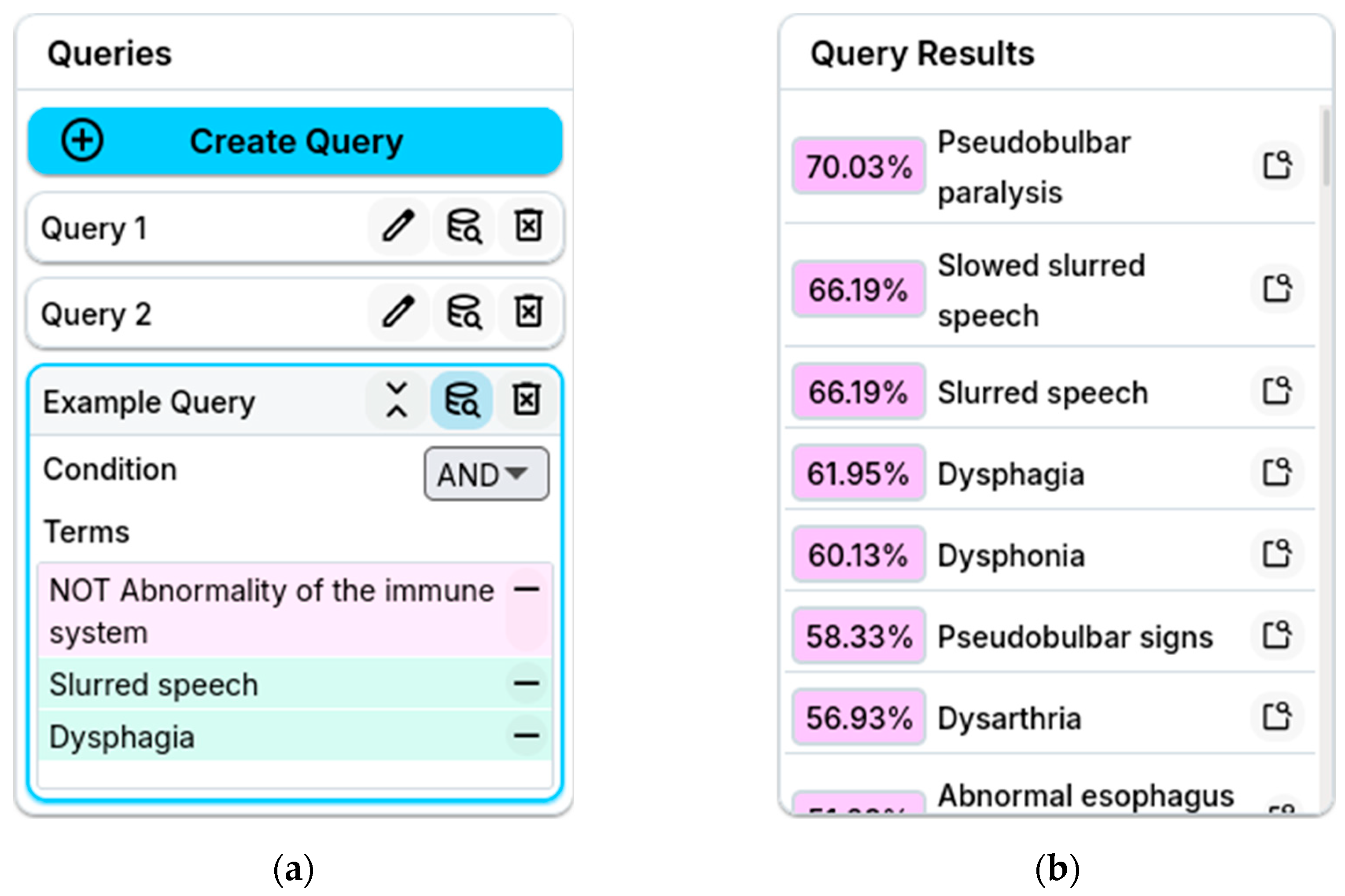 Example 1. To illustrate our querying approach, consider a physician, whom we refer to as the user, exploring HPO to investigate a patient’s symptoms: difficulty speaking and swallowing, with no indication of immune dysfunction. The user suspects a neuromuscular issue but is unsure of the precise terminology.