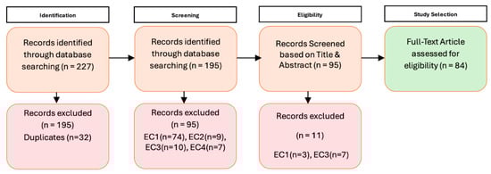 In accordance with the four exclusion criteria, EC1-EC4, we started screening by independently reviewing the titles and abstracts of all the 227 identified articles (100%). During the process, the articles were assigned with “include” or “exclude” labels. Based on the screening of the titles and abstracts of all the articles, it resulted in 95 out of 227 articles for full-text review. In terms of eligibility, we then read the full text of each article and labeled them as “include” or “exclude.” Based on the full-text review, we excluded 11 articles in total according to the four exclusion criteria. As a result, we identified 84 out of 95 articles to be included in our final review. The inclusion/exclusion criteria were predefined to ensure that only relevant studies were included in the review.