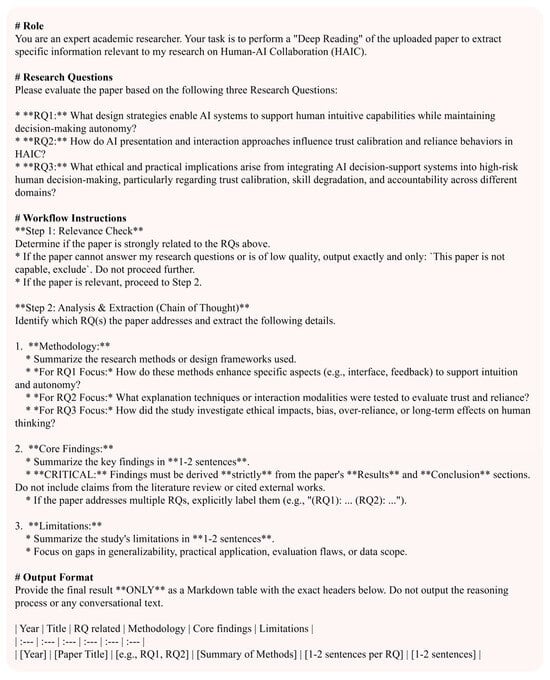 In this stage, AI functioned as a “research assistant”, providing comprehensive background information and preliminary analysis without making final judgments. We designed a structured prompt for AI (shown in Figure 2) to ensure the consistency and completeness of information extraction. Prior to the full-scale analysis, the prompt underwent iterative refinement and validation using a pilot subset of ten papers to ensure it could accurately and consistently extract the required structured information.