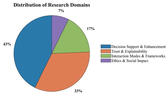 The literature reveals four distinct research clusters that capture the evolving landscape of HAIC, with Decision Support and Augmentation (35 papers, 42.7%) leads, focusing on enhancing decision making in fields like medicine and marketing. Post-2023 studies leverage generative AI for adaptive agents and decision-oriented dialogs. Trust and Explainability (27 papers, 32.9%) explores trust dynamics and explainable AI, with recent work (2024–2025) addressing trust calibration and cognitive biases. Interaction Patterns and Collaboration Boon Frameworks (14 papers, 17.1%) designs adaptive systems for seamless collaboration, emphasizing communicative agents in healthcare and security. Ethics and Social Impact (6 papers, 7.3%) examines moral implications and standardization, particularly in aviation and ethical decision making (shown in Figure 4).