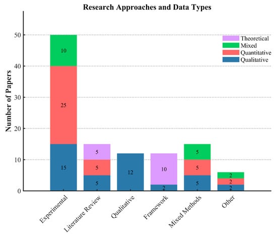 Research methodologies in HAIC studies demonstrate diverse approaches to data collection and analysis, with experimental studies (41.5%, N = 34) dominating the field, primarily utilizing quantitative (70.6%) and mixed methods (29.4%) to validate metrics such as trust calibration. Literature reviews (18.3%, N = 15) and mixed methods studies (18.3%, N = 15) each employ balanced distributions of data types. Qualitative studies (14.6%, N = 12) exclusively use qualitative data to capture user experiences, particularly in healthcare settings. Framework/theoretical studies (13.4%, N = 11) predominantly rely on theoretical data (81.8%) to develop conceptual models. The remaining studies (7.3%, n = 6) distribute evenly across qualitative, quantitative, and mixed approaches, often addressing specialized applications (shown in Figure 5).