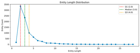 Figure 5 shows the distribution intervals of entity lengths, where Q1 represents the lower quartile, Median represents the median, and Q3 represents the upper quartile. Q1 = 2 indicates that 25% of entity lengths fall between 1 and 2; Median = 3 indicates that 50% of entity lengths are less than or equal to 3; Q3 = 4 indicates that 75% of entity lengths are less than or equal to 4. The statistical results in Figure 5 suggest that local information is crucial for improving model performance, which is why the MKN module is designed to capture more local information.