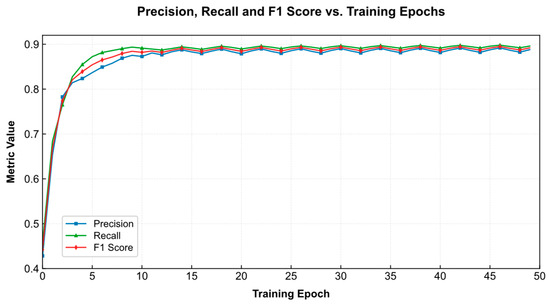 The trend of training loss in Figure 6 shows that the loss decreases rapidly at the beginning, and when the training reaches the 25th epoch, the training loss is close to zero, fully demonstrating that the model has a good convergence speed. To understand the stability of the model, the trends of accuracy, recall, and F1 score are plotted, as shown in Figure 7.