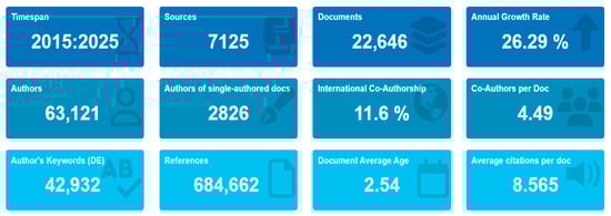 To explore the topic, a combination of datasets from Scopus and WoS between January 2015 and May 2025 was merged. Figure 2 presents 22,646 documents, of which 2826 were single-authored publications across 7125 sources. Within the context of AI and HEIs, there was an average citation per document of 8.565 from references of 684,662 between 2015 and 2025. The average citations per document indicate a significant usage trend and annual growth rate of 26.29% in the past decade on the topic, as depicted in Figure 2. Nonetheless, it is interesting to note that acceleration points are mainly depicted between 2023 and 2025, as shown in Figure 3. This could be attributed to the limited interest in AI within HEIs from 2015 to 2022 [32]. Findings in Crompton and Burkes Crompton and Burke [33] concur that there were limited opportunities with challenges and less interest at HEIs before 2023. Considering this, it is anomalous that bibliometric studies present a positive trajectory and narrative on AI in HEIs from 2015 to 2022 [34,35,36,37,38]. Conversely, the period 2015 to 2022 demonstrated limited upward mobility due to the infancy of the topic [39]. Furthermore, numerous bibliometric studies concur with Khan et al. [39], indicating low growth trends before 2023 [34,35,36,37,40,41,42].