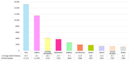 Figure 5 and Figure 6 highlight the top-performing countries in scientific production from 2015 to 2025, addressing aspects of RQ1 and RQ3. Figure 5 distinguishes between MCPs, which depict “inter” (working together with authors in two or more countries), and SCPs—“intra” (authors collaborating within a country). The MCP ratios of the eight countries are moderate and similar in terms of “inter” relationships outside their countries—Figure 5. This means that corresponding authors in scientific production outside their own countries is significant, yet still incomparable to China (MCP—220) and the USA (MCP—203), the top two performing countries in Figure 5. Interestingly, Figure 6 illustrates “average article citations” and “total citations” in which China and the USA are also the torchbearers in scientific production on the topic. These results suggest a correlation between Figure 5 and Figure 6, with China and the USA consistently taking the lead, albeit in different rankings. Moreover, Avelar, da Silva Oliveira [73] expound that these partnerships transcend beyond research and contribute to the public and private sectors with a comprehensive representation of the 17 SDGs. The values of SDGs are also reflected in Figure 5, wherein the leading countries are the torchbearers in AI within the context of HEIs and industry. Additionally, correlations of this nature are important as knowledge-sharing partnerships develop that have the potential to enhance curriculum design, assessments, research, technology, and innovation through a multidisciplinary approach, globally, at HEIs. Moreover, the inference made in Table 3 about Asian scholars and their affiliations as leading scholars to countries in the Far East or other countries is laid to rest since the “inter” networks between the USA and China are strong, as displayed in Figure 5.