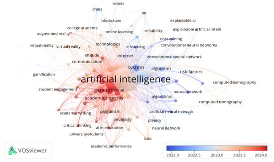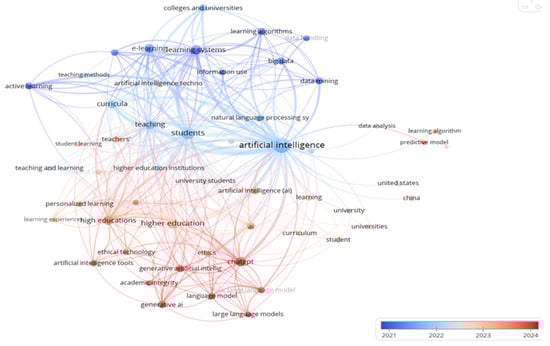 To further explore AI and HEIs, this study examined the strength of co-occurrence networks from Scopus and WoS using the data from Figure 1 (Stage 2). To facilitate this analysis, the authors used VOSviewer, a software tool (Version 1.6.20) for constructing, visualizing, and assessing the strength of clustering relationships, to identify patterns in the topic [74]. Within this context, we selected the Type of analysis—Co-occurrence and Unit of analysis—All keywords on VOSviewer. The counting method used was Full counting, as this assured that co-occurrence keywords had equal weighting. Initially, 300 keywords were selected in the setting section with 19 occurrences. A verification process was followed, and irrelevant keywords were manually removed from the software to create a bibliometric network. Figure 7 (Scopus) and Figure 8 (WoS) illustrate the occurrences of keywords using an overlay visualization and average publication per year aligned to the past decade on AI and HEIs.